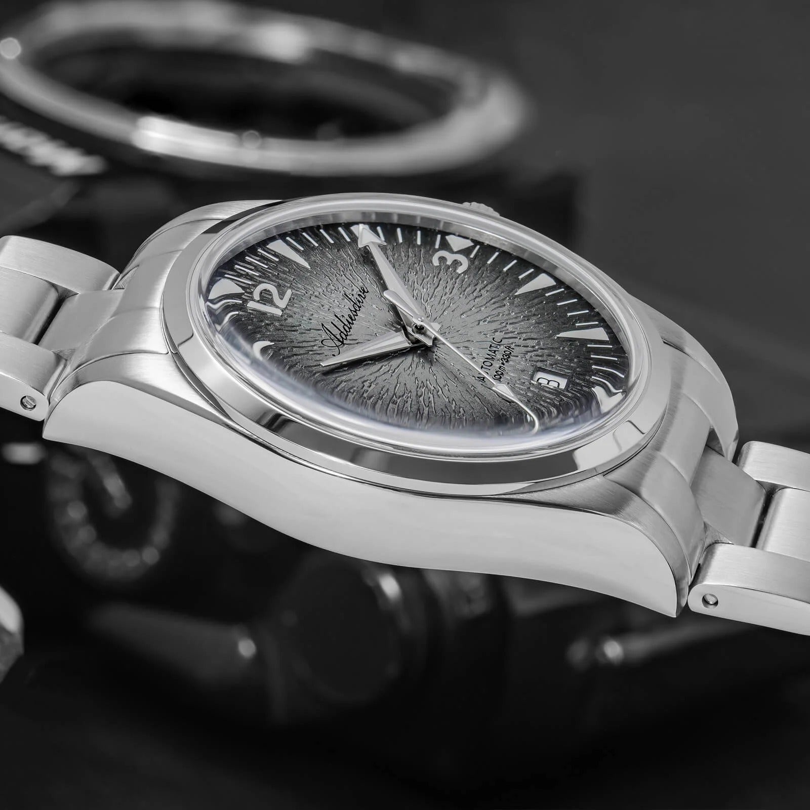 Functions: 3 hands + date, 21,600 vph (3Hz), hacking, bi-directional winding, 21 jewels, 41h power reserve