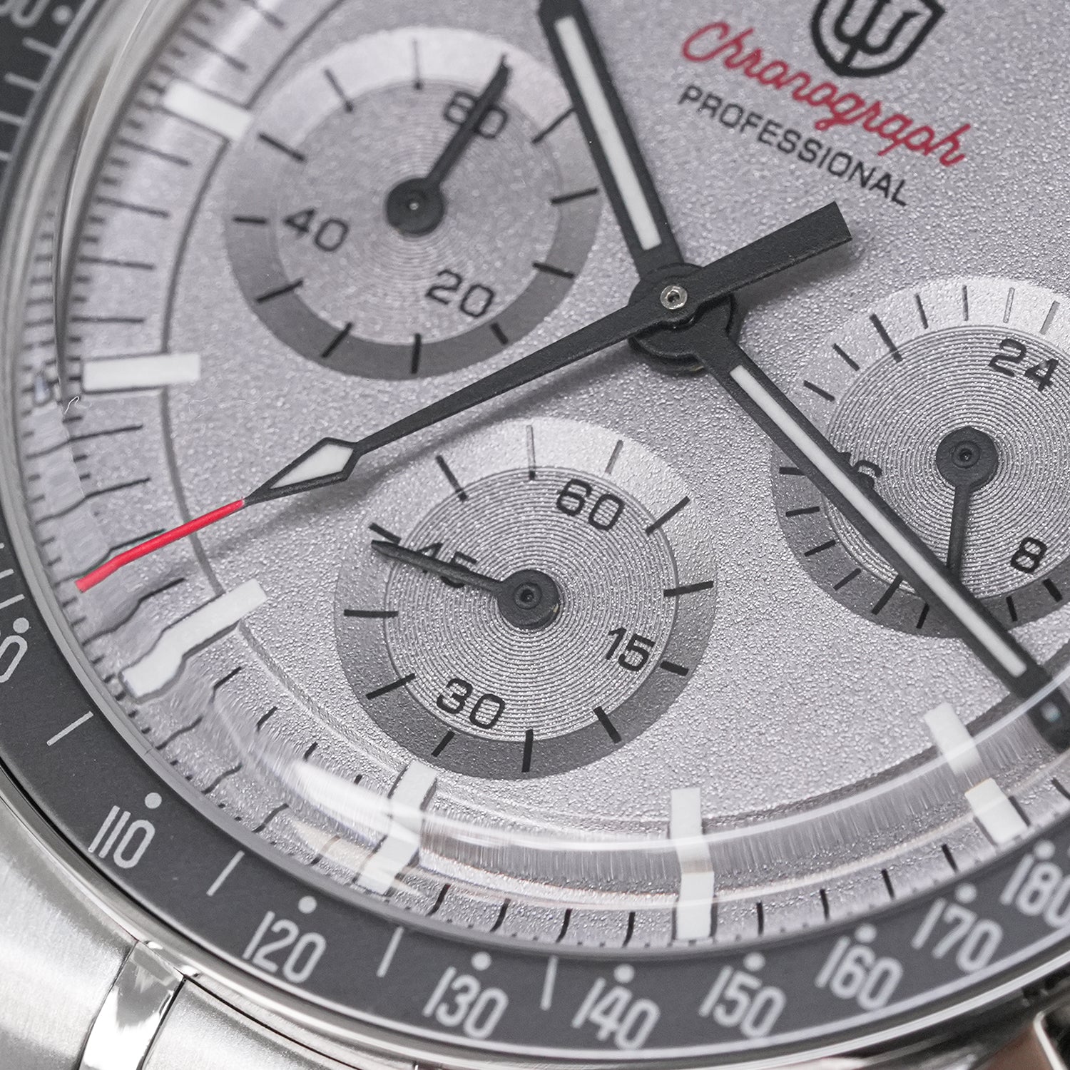 Due to the nature of this manufacturing process, very minor black particles may be visible under high magnification at the junction between the brushed metal finish and the silver chapter ring. This is a normal process characteristic and is not visible during normal wear.