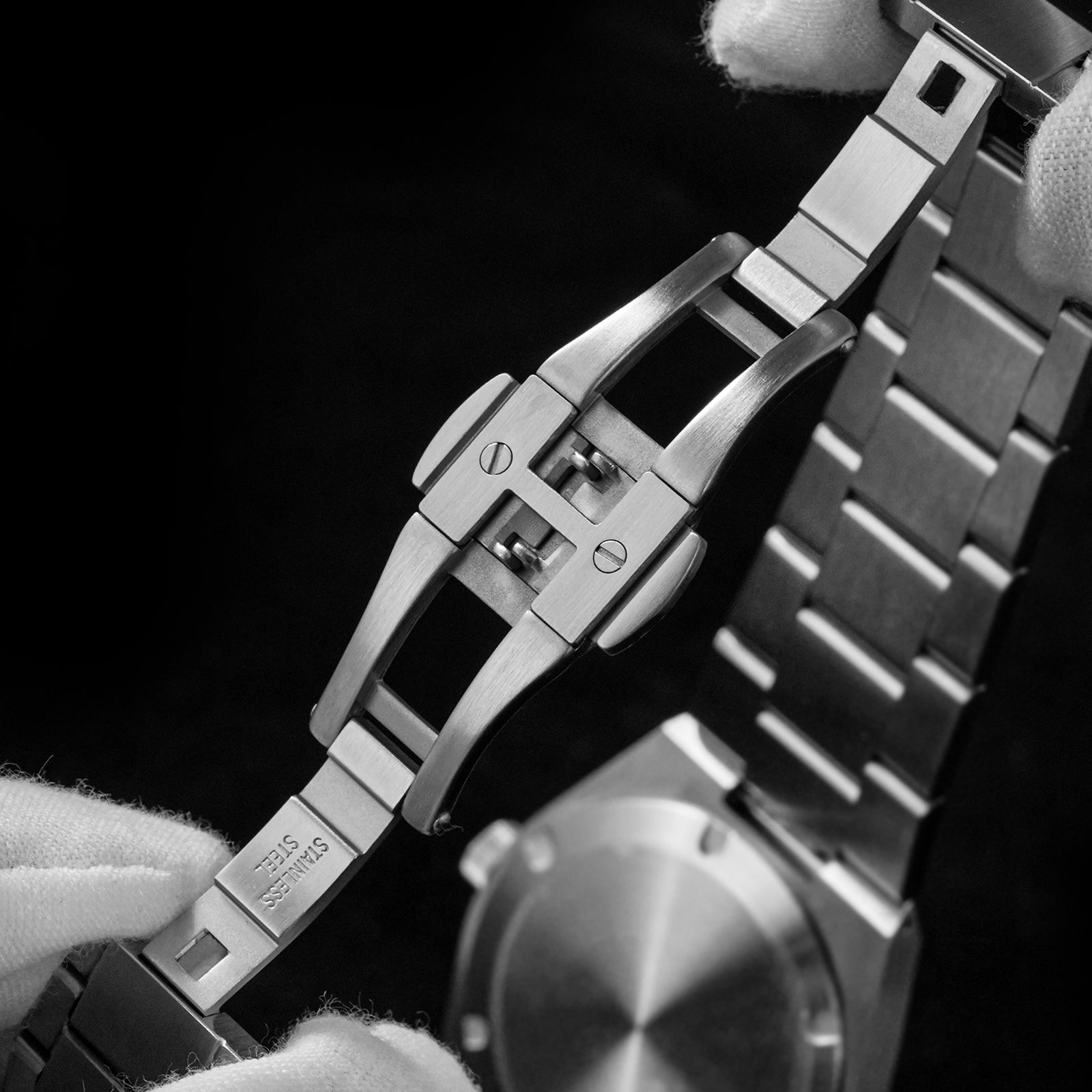 Bracelet & Clasp: Solid stainless steel bracelet (22.5 mm tapering to 16 mm), robust butterfly clasp. Comes with 2 removable half-links for precise wrist sizing.