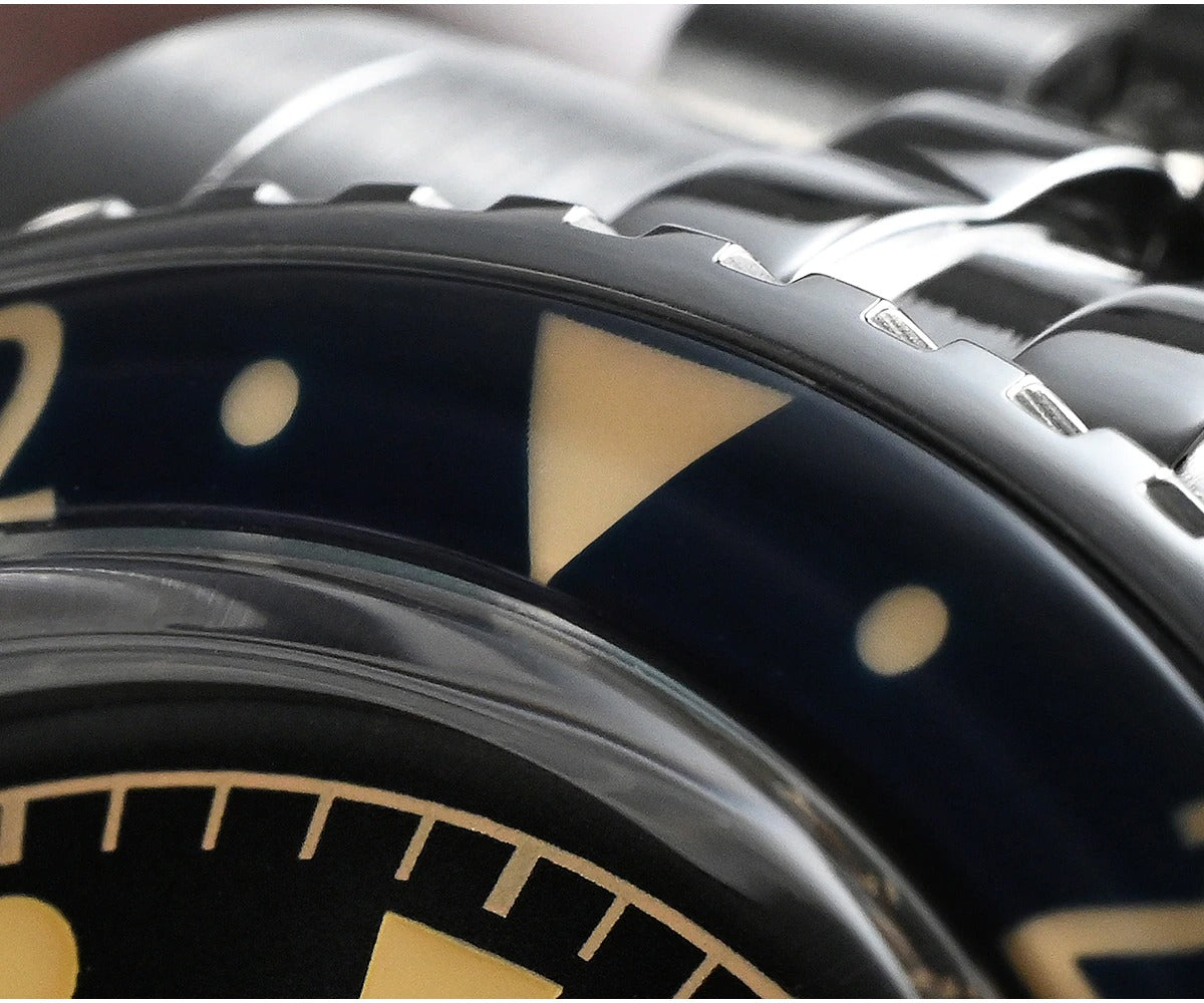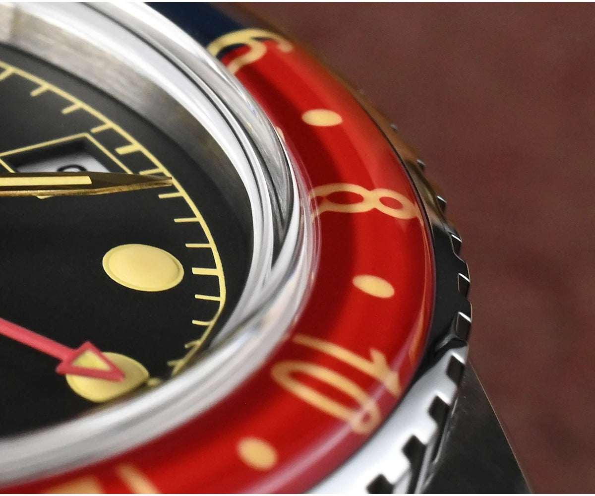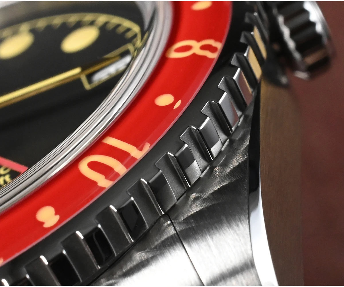 Bezel: Bidirectional 24 Clicks Bezel, Vintage Red & Blue Sapphire Glass Bezel, Full Luminous Markers