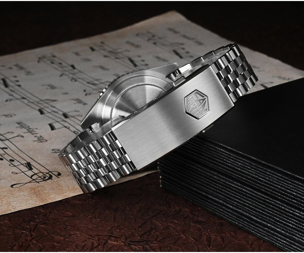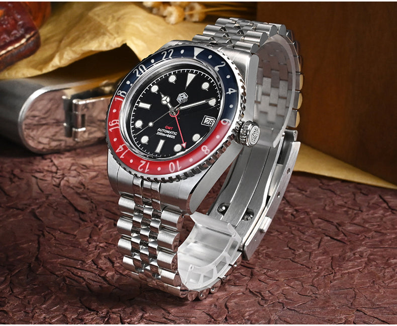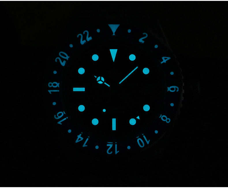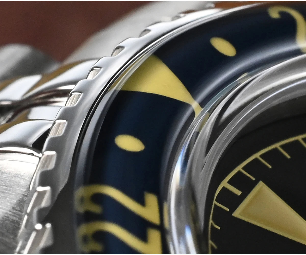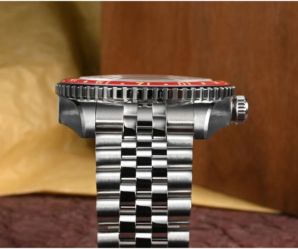 Bezel: Bidirectional 24 Clicks Bezel, Vintage Red & Blue Sapphire Glass Bezel, Full Luminous Markers