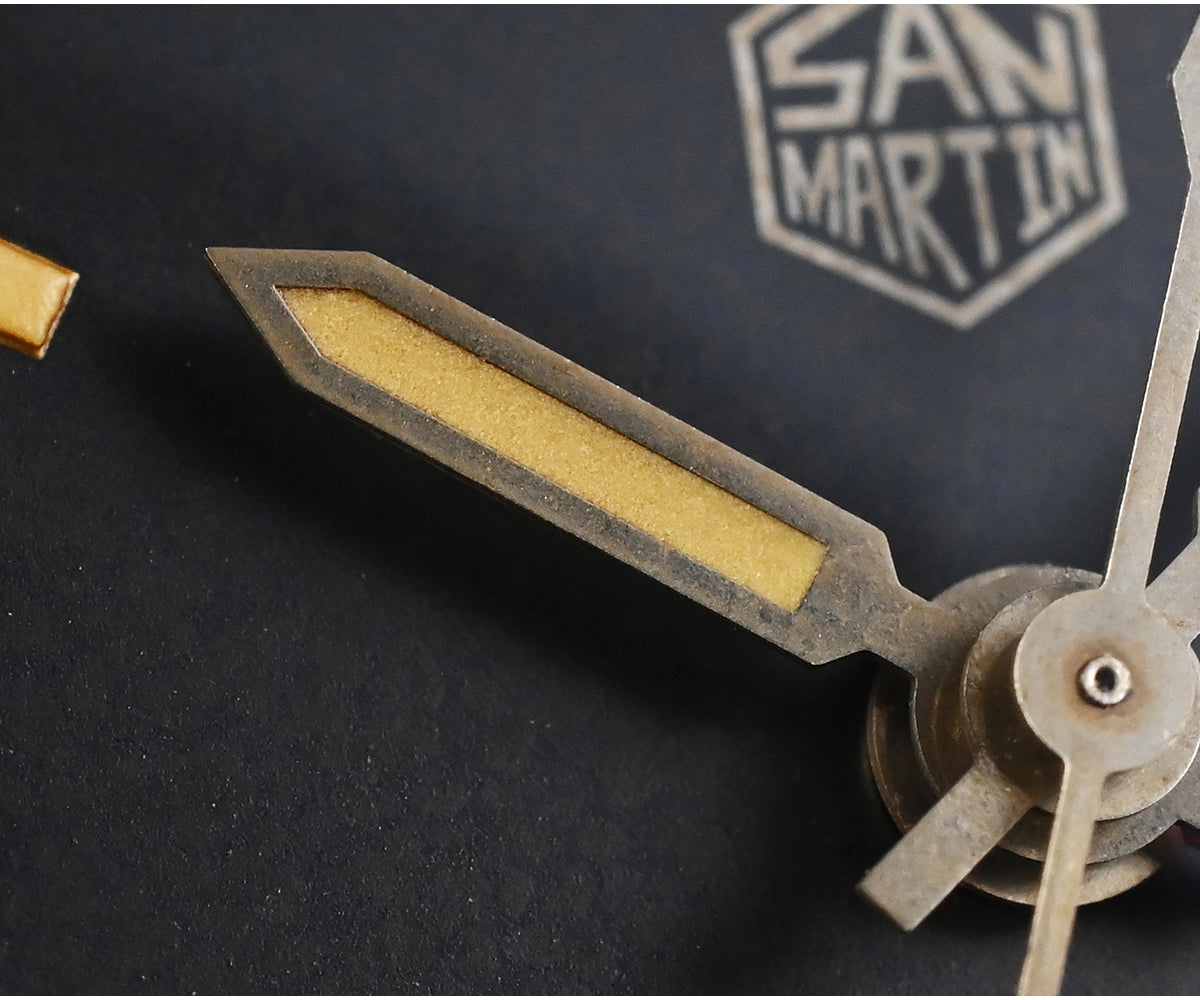 Dial: Vintage Black Dial / Vintage Dark Blue, With Applied 3D Hexagon San Martin Logo And Applied Indices, With 6H Date Window