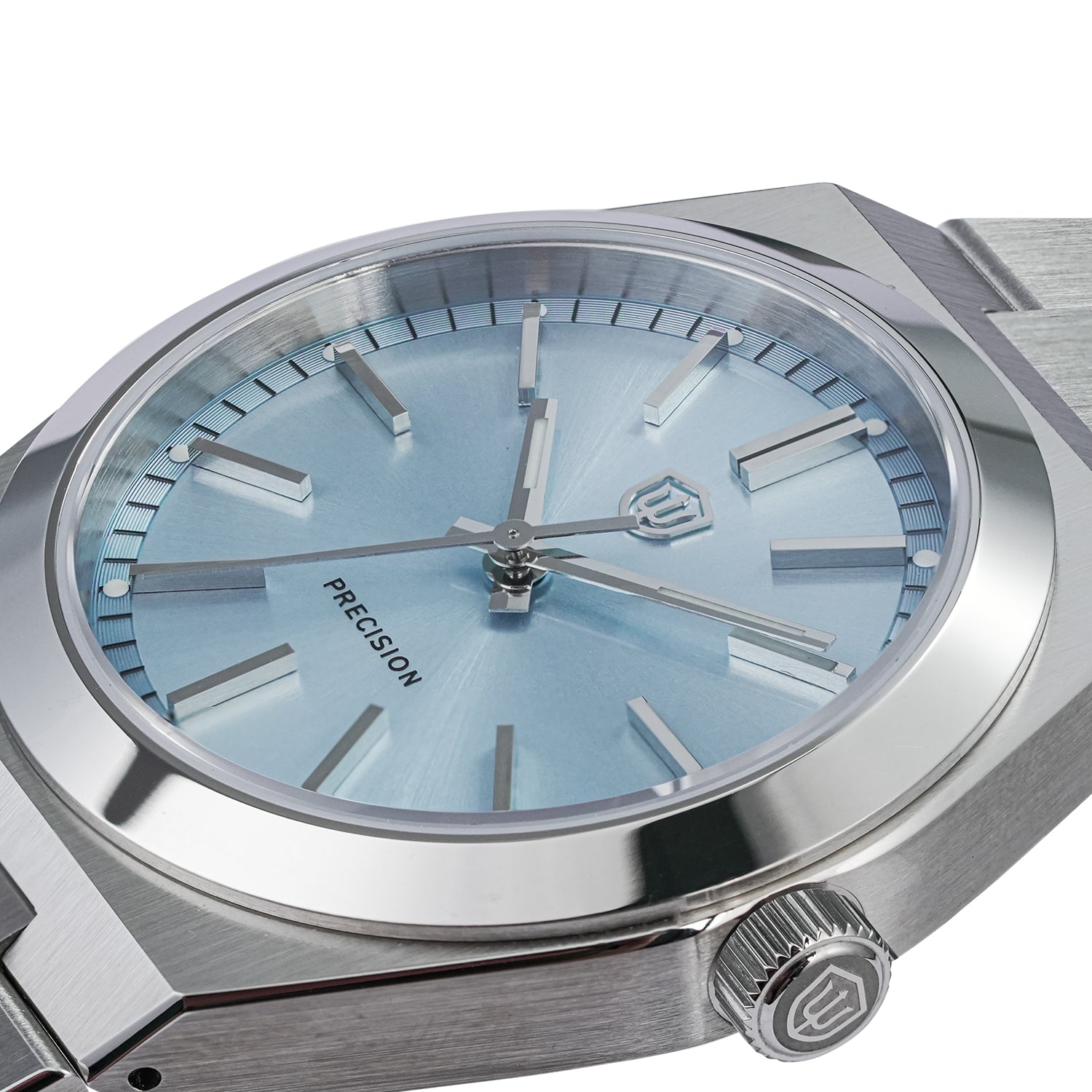 Dial: Enamel sunburst (silver or light blue) with extra-thick A-grade applied indices and sharply finished hands.